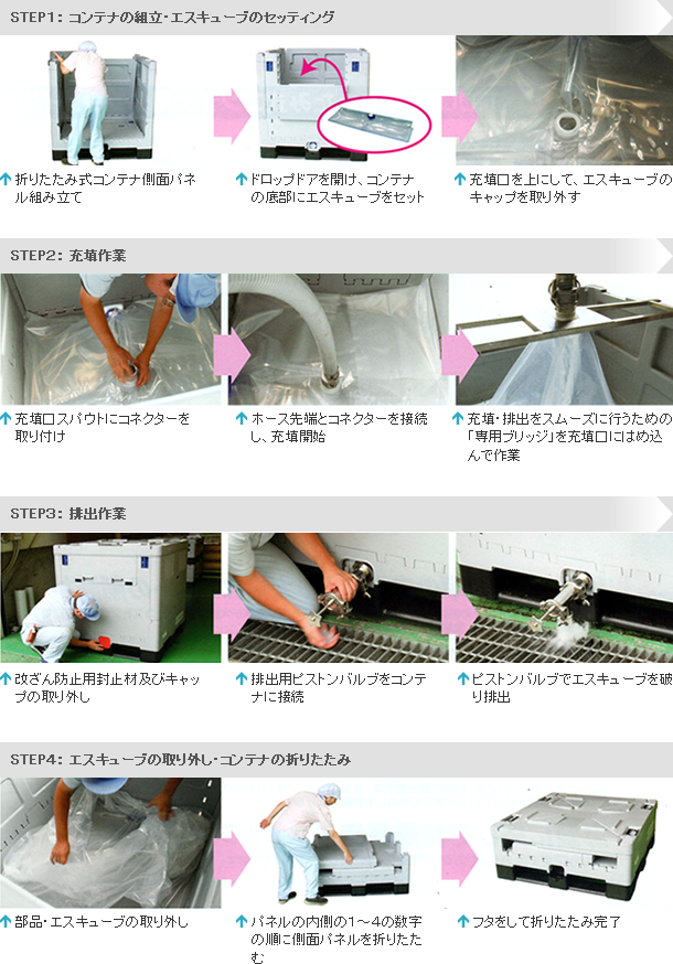 200リットルドラム缶などの輸送容器と比較して、輸送効率と作業効率が大幅に上がり、コストダウンが可能です。また、容器洗浄が不要な為、洗浄の手間とコストも省けます。